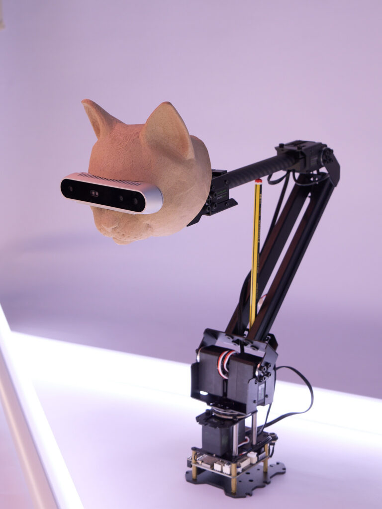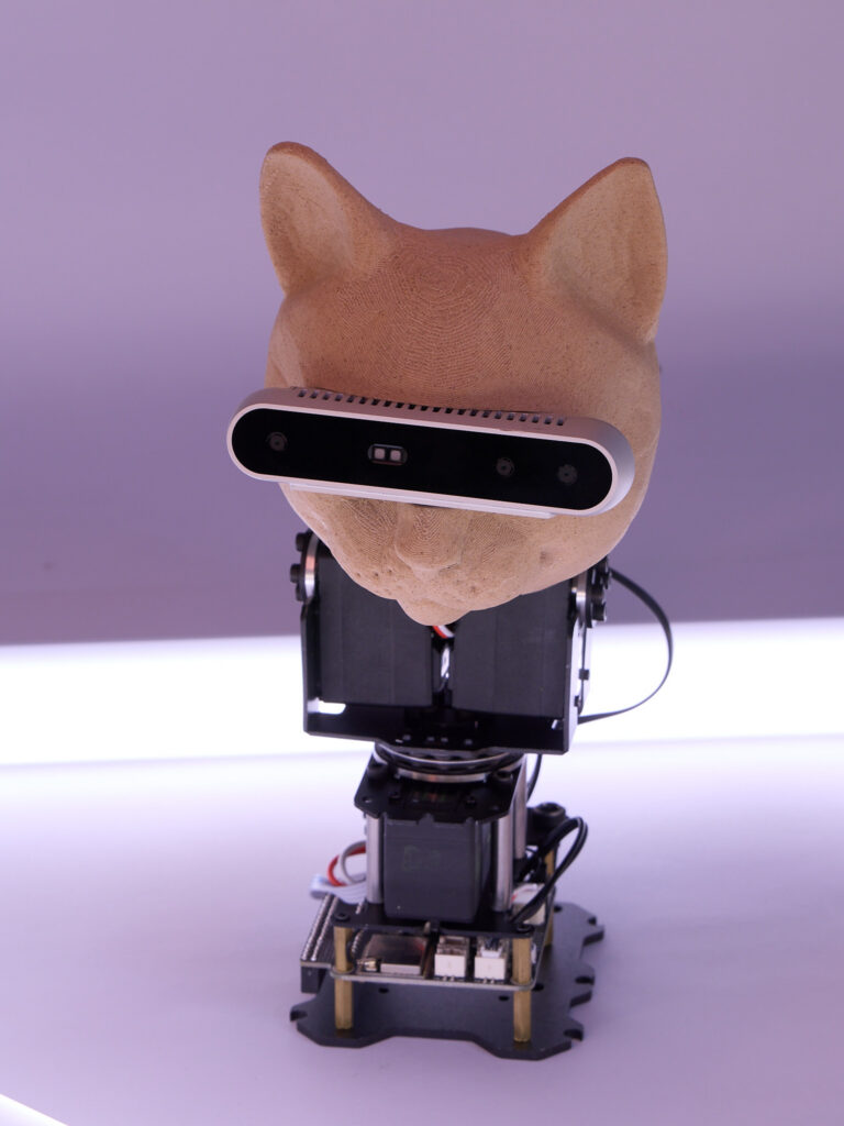 The CatCoBot has different emotional conditions it can be in, impacting the behaviour and movement of the arm. Currently it can detect and follow faces, recognizes a wide set of hand gestures and show emotional conditions that can be affected by the users interactions.